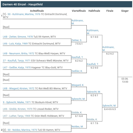 02.06.2018 - Unser Mitglied Maike Sybrecht (Damen 30) hat sich beim WTV Damen 40 Einzel-LK-Turnier erfolgreich durch das Halbfinale gekämpft. Morgen wünschen wir ihr viel Erfolg beim Endspiel in Gelsenkirchen! Wer das Spiel live miterleben möchte ist herzlich eingeladen, morgen mitzufiebern: Um 13 Uhr im TC Blau-Weiß-Grün in 45894 Gelsenkirchen in der Gysenbergstr. 50!