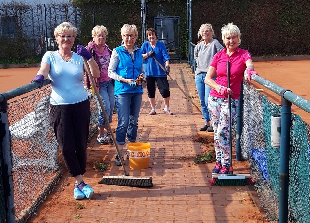 Unsere Damen 60 haben kurzzeitig die Tennisschläger gegen Gartengeräte getauscht und - immer mit Abstand - dem Unkraut auf unseren Wegen den Garaus gemacht.